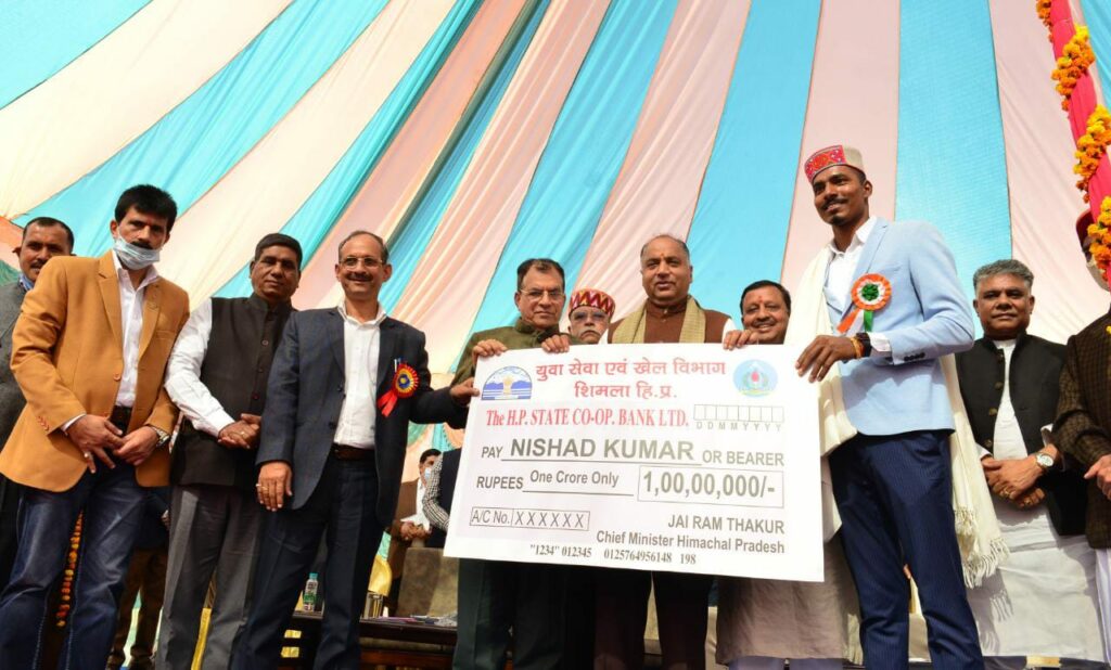 Shimla News CM awarded Nishad Kumar for winning medal in Tokyo Olympic By Keekli Desk - November 19, 2021 0 540 CM presenting a cheque of Rs 1 crore to Nishad Kumar of Una for winning medal in Tokyo Para Olympic at Una Daily News Bulletinhttps://youtu.be/jpWmzu4eWRs