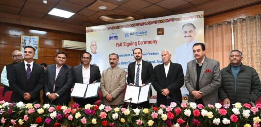 The Himachal Pradesh government signed three Memorandums of Understanding (MoUs) with the National Dairy Development Board (NDDB) in the presence of Chief Minister Sukhvinder Singh Sukhu to strengthen the dairy sector and ensure direct financial benefits for farmers. The agreements were signed by Animal Husbandry Secretary Ritesh Chauhan and Milkfed Managing Director Abhishek Verma on … Continue reading Dairy Sector Push: HP Signs Agreements with NDDB