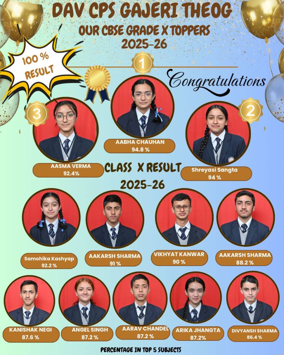 सीबीएसई द्वारा जारी दसवीं कक्षा के परिणाम में डीएवी सेंटेनरी पब्लिक स्कूल, गजेड़ी (ठियोग) के विद्यार्थियों ने शानदार उपलब्धि दर्ज की है। विद्यालय ने इस वर्ष शत-प्रतिशत परिणाम हासिल किया।