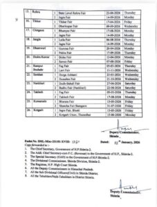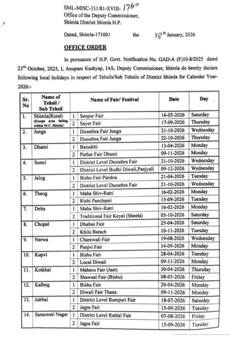As per Govt notification, Shimla DC Anupam Kashyap declared the following local holidays in respect of Tehsil/Sub-Tehsils of Shimla District for Calendar Year 2026.