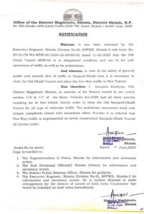 जिला दंडाधिकारी शिमला अनुपम कश्यप द्वारा जारी एक अधिसूचना के अनुसार, पुरानी संजौली-ढली सुरंग को तत्काल प्रभाव से सभी प्रकार के वाहनों और पैदल यात्रियों की आवाजाही के लिए बंद कर दिया गया है।