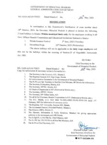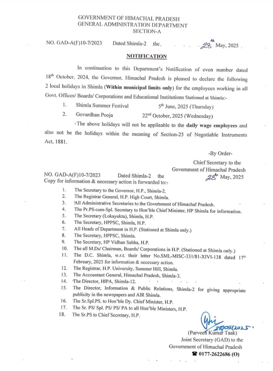 Current AffairsHimachal Two Local Holidays within MC Limits Announced – 5 Jun & 22 Oct By: Keekli Desk Date: May 28, 2025 Share post: FacebookTwitterPinterestWhatsAppLinkedin Daily News Bulletinhttps://youtu.be/mgPxegTGGxw Share FacebookTwitterPinterestWhatsAppLinkedin Previous articleशिक्षकों के 937 पदों पर होगी भर्ती, रोहड़ू में शिक्षा मंत्री ने की घोषणाNext articleSt. Thomas’ School Champions Inclusive Education with ‘Sapno Ki Udaan’ Youth Theatre Festival Keekli Desk LEAVE A REPLY Cancel reply Comment: Please enter your comment! Name:* Please enter your name here Email:* You have entered an incorrect email address! Please enter your email address here Website: Save my name, email, and website in this browser for the next time I comment. Δ Related articles Current Affairs Himachal CM Promotes E-Mobility, Flags Off E-Taxis Chief Minister Thakur Sukhvinder Singh Sukhu today flagged off 18 electric taxis from his official residence Oakover under... Current Affairs रामपुर बुशहर में अग्निवीर भर्ती, SDM नोडल अधिकारी भारतीय सेना में भर्ती के इच्छुक युवाओं के लिए एक महत्वपूर्ण अवसर आने वाला है। सेना भर्ती कार्यालय,... Current Affairs Centre Sanctions Ropeway for Shimla: Agnihotri In a major boost to Shimla's urban mobility infrastructure, Deputy Chief Minister Mukesh Agnihotri today announced that the... Current Affairs Advanced Surgery Facilities for Nerchowk GMC CM Sukhu, while presiding over the IRIS-2025 programme at Lal Bahadur Shastri Government Medical College, Nerchowk (Mandi district),...